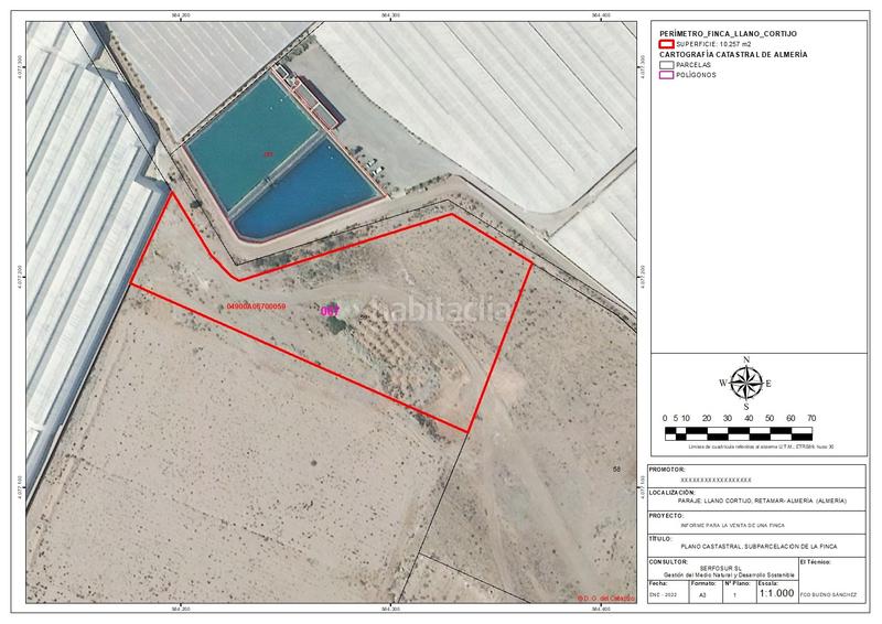 f765 se vende finca en retamar, en el término municipal de almería, con una superficie total de 10257 m². en un entorno de cultivo bajo plástico y susceptible de cultivo al aire libre. bien comunicada, a través de carretera n-344 y autovía del mediterráneo, a-7. se accede a través de camino de tierra que a 700 metros enlaza con la carretera al-3115 y en 2 km comunica con la población de retamar y con la n-344. se trata de un terreno prácticamente llano en estado de baldío con una pendiente media de 1,15% y a una altitud de 40 m.s.n.m. ideal para vallarlo y usarlo como campa, aparcamiento de camiones, tener animales, etc. trancos para ampliar información, preferentemente enviar mensaje a través de este anuncio